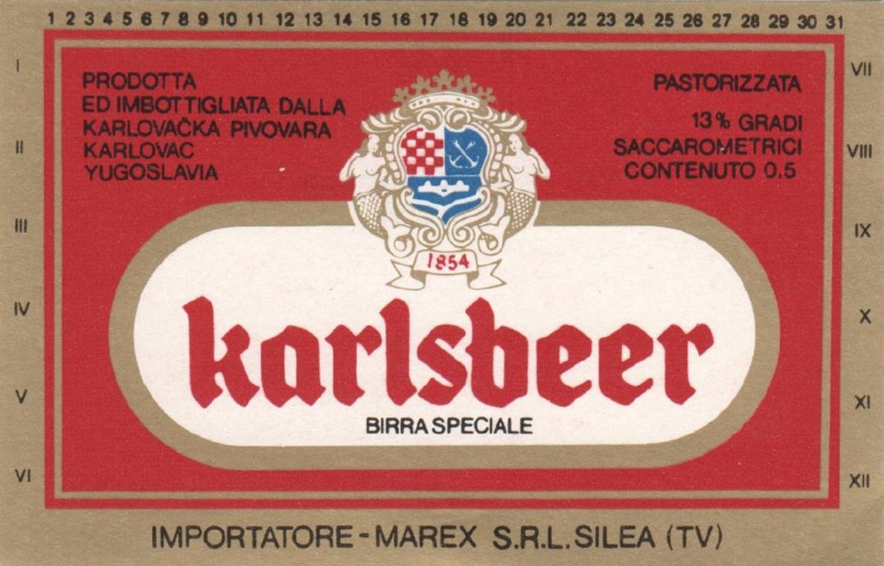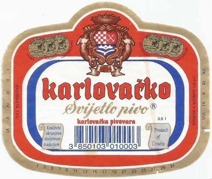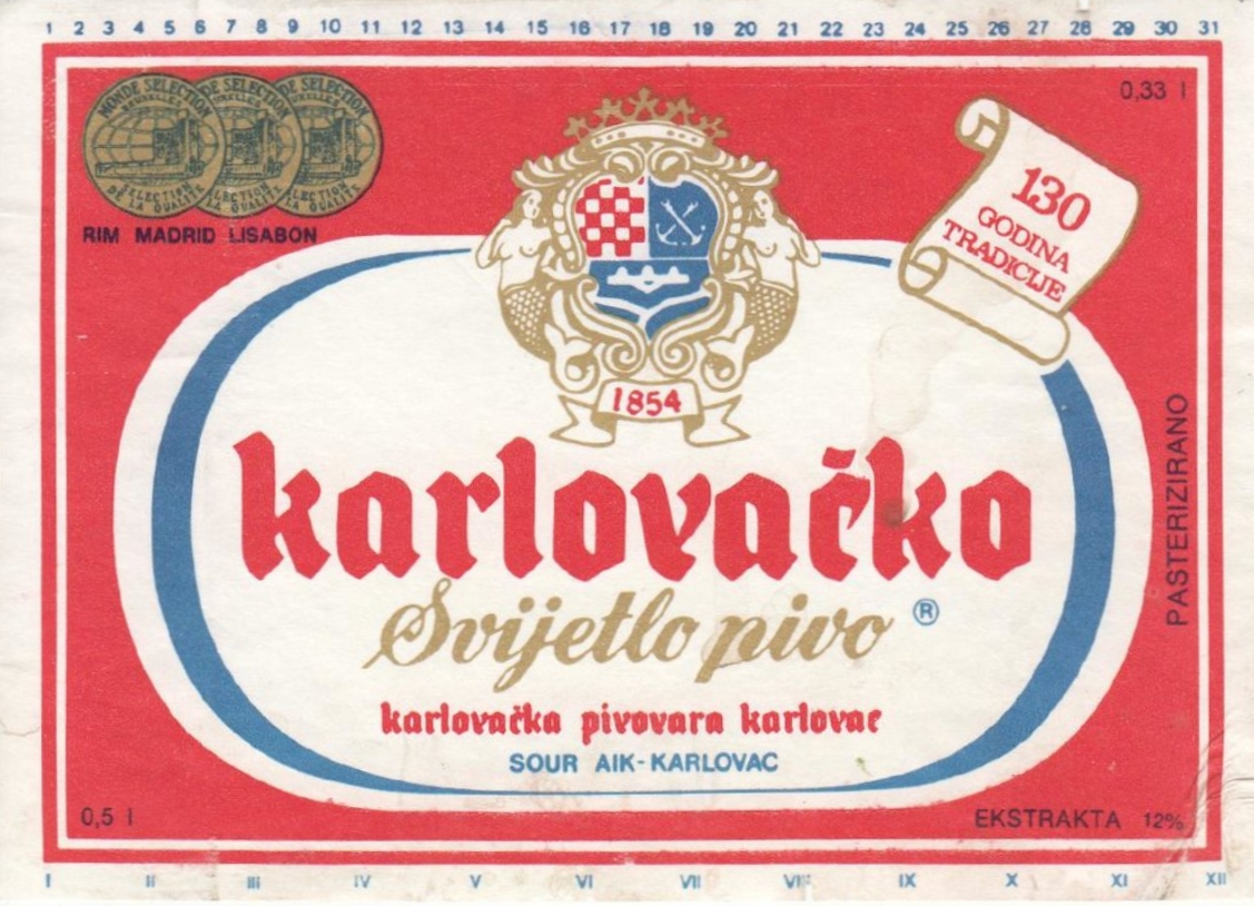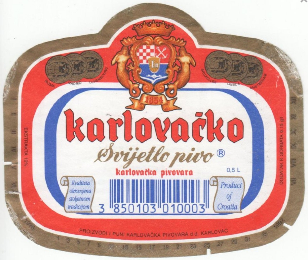 Logo evolution, minute and gradual changes to the logotype over time, are also important method for dating caps. Heraldic part of the logo for Karlovačka brewery had the upper right part with anchors on the blue background from mid 1970's, up to late 1980's, proven by included bottle labels (1979, 1984, and 1989. for 125th, 130th, and 135th anniversary). Interesting thing about anchors is that the logo contained 2 crossed anchors since its creation, as they are in the coat of arms of the city of Karlovac, to be changed in 2015. when pair of anchors was replaced by a single one. Since the early 1990's (but not in 1991, the first year of Croatian independence), a small shield was added in the middle of the big shield with initials "I II" (Josip II), as is on the coat of arms of Karlovac. Year 1997. was also very interesting, since 3 details of the logo changed: 1. ribbon with year 1854 under the heraldic shield disappeared, 2. position of diacritic changed in letter "č" of the word "karlovačko", and 3. letter 'v' changed. Even the word "karlovačko" was changing from the 1960's to become in only 2003. "KARLOVAČKO", and then to continue as "Karlovačko" (in different font) until present.