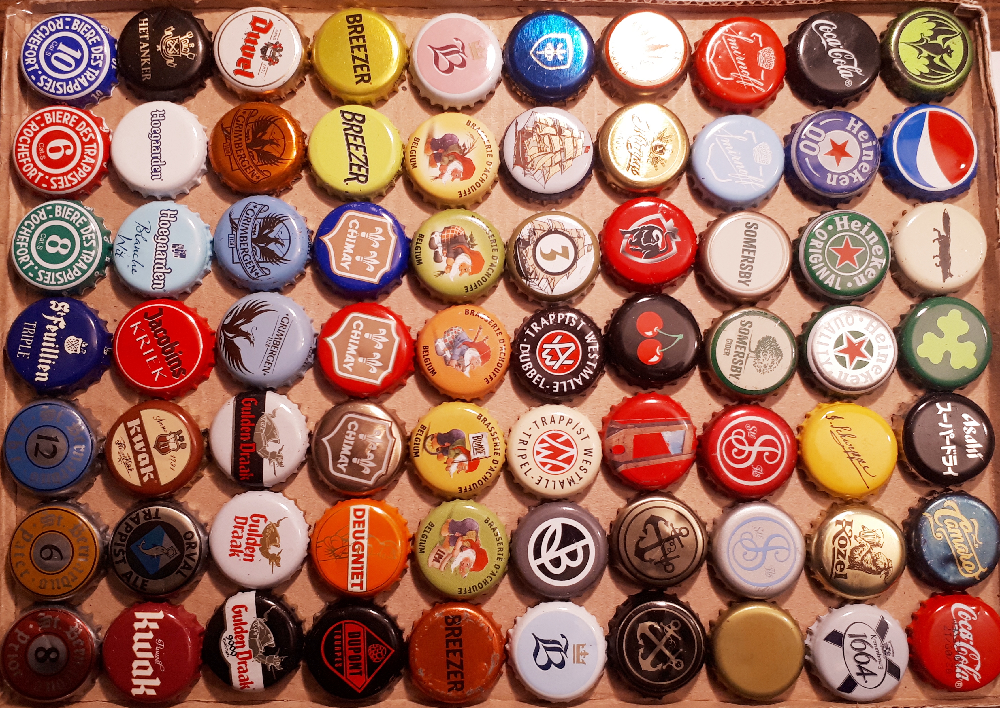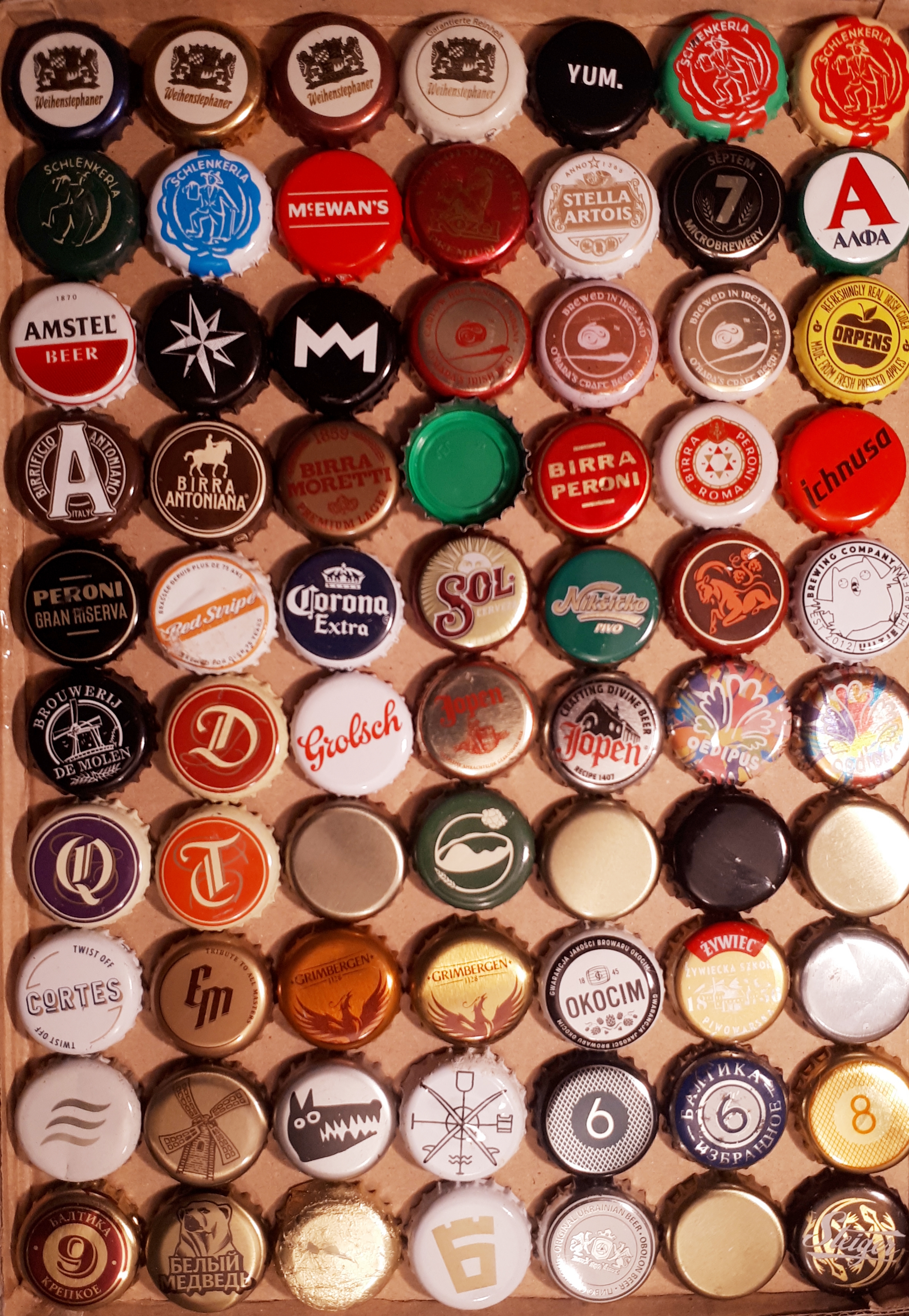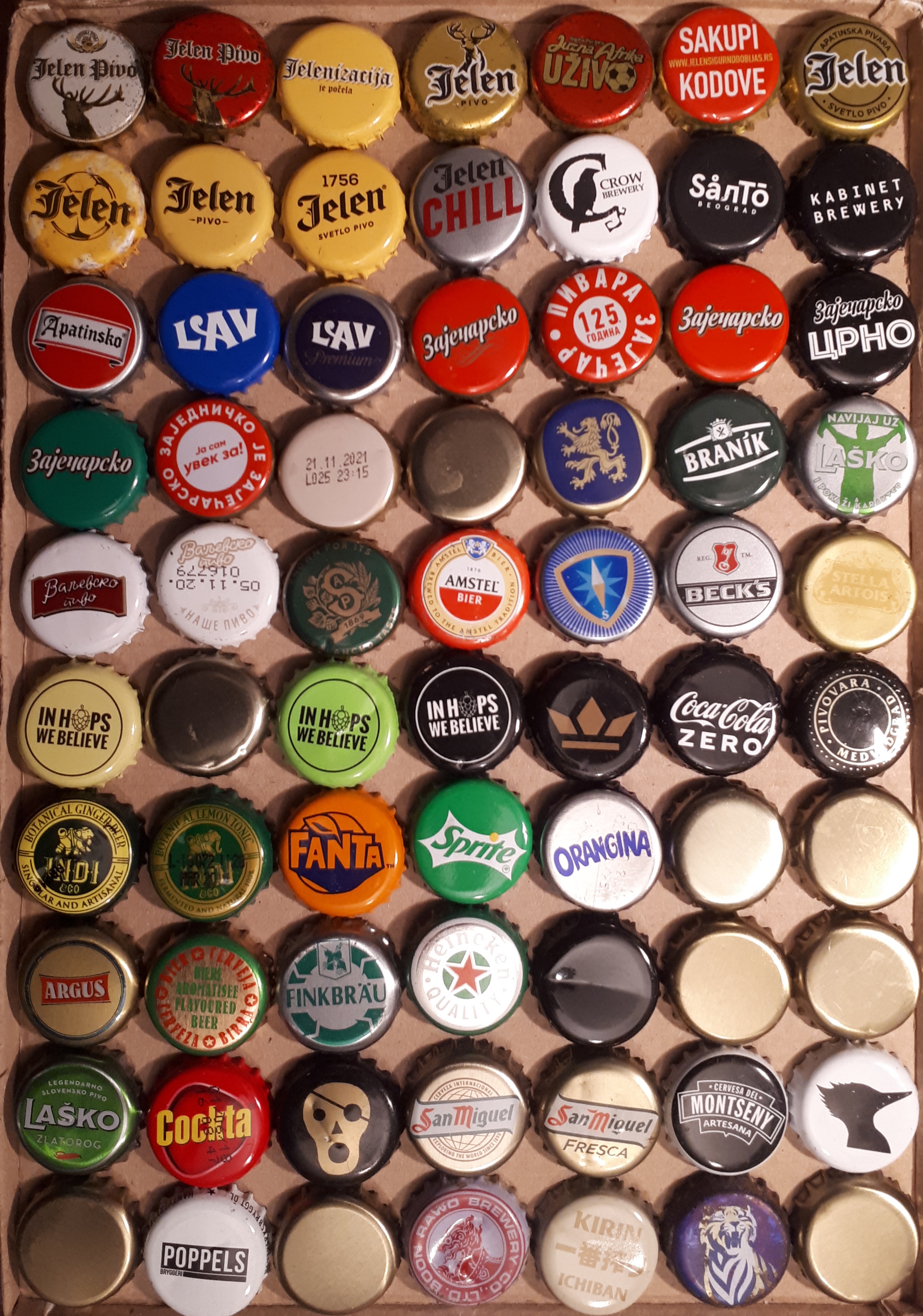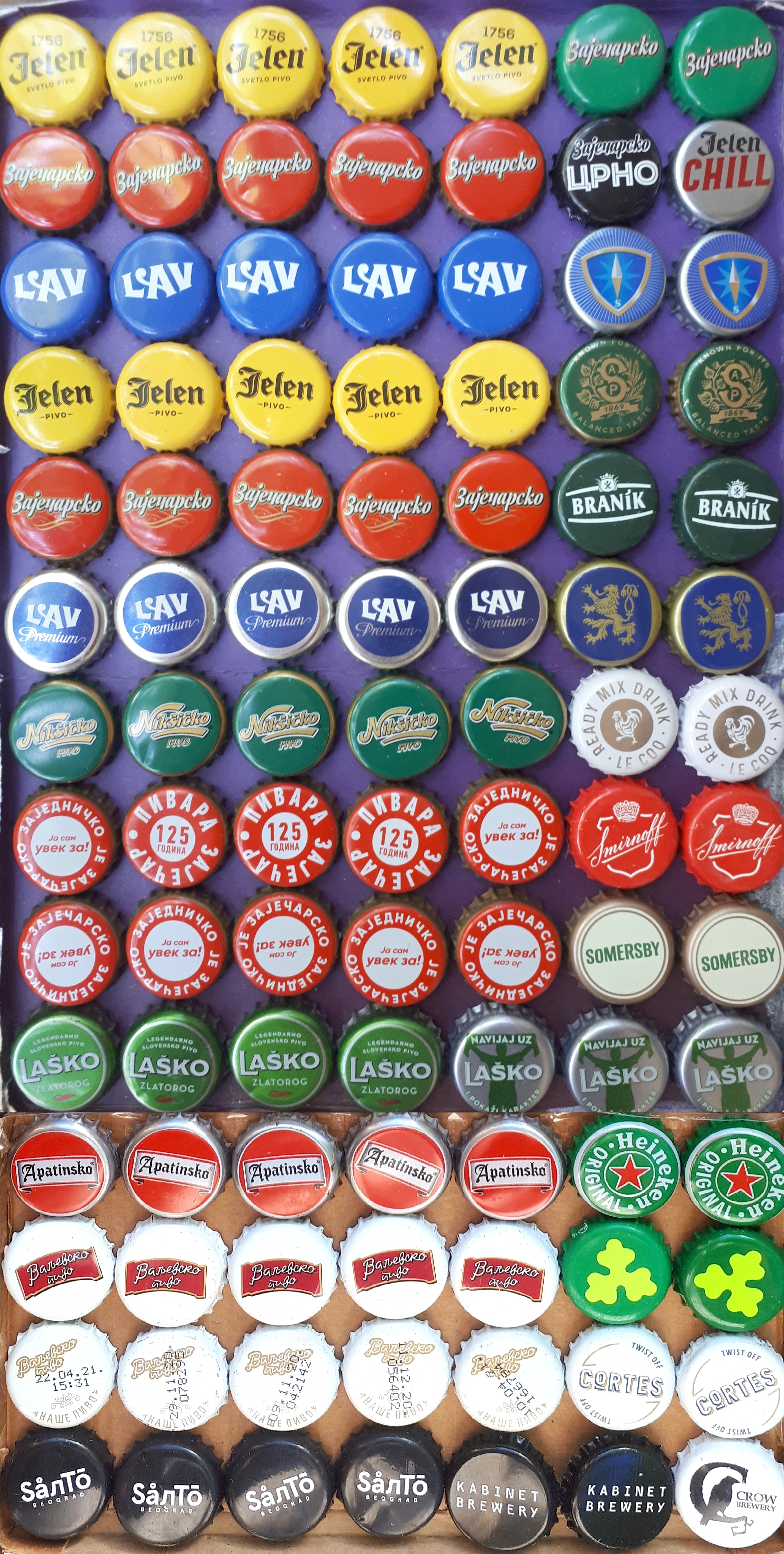 First 3 rows of 5 are the most prominent Serbian beer brands (Jelen, Zaječarsko and Lav) followed by previous years Jelen and Zaječarsko caps. Nikšicko and Nikšicko dark are Montenigrin beers but bottled in Serbia (as is Laško, Slovenian beer, Staropramen ("S"), Lowenbrau, and Branik, Czech beer). Then there are other versions of Zaječarsko (green for Special, gold for 0.33 l, and black for dark beer). There is also a commemorative Zaječarsko 125 years, and the latest one (Zajedničko je Zaječarsko). You are also getting 3 most important craft beer caps: Salto, Kabinet and Crow. A variety of smaller brands as Apatinsko, Valjevsko (old and new) are in the set as well. Featured are also Jelen Chill, and Lav Premium. Le Coq, Cortes, Heineken, and Carlsberg are the most presented foreign brands here in Serbia. Since some of the caps are out of production, others are caps rarely offered in exchanges, I trade them for the same number (98) of your regular different caps of my choice. Unfortunately there are no more domestic beer brands in Serbia, so I am offering 1, 2 or 5 each cap, but I am sure you will easily use them in further cap exchanges.