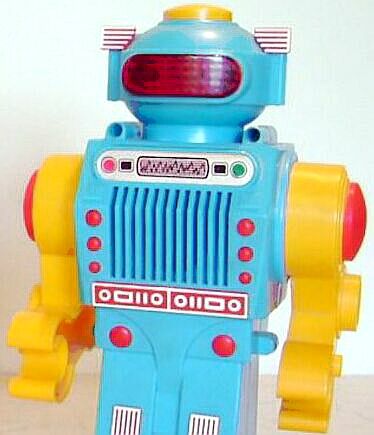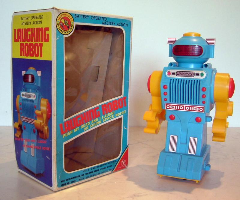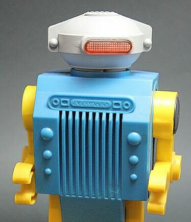 Recent find: Yonezawa Laughing Robot, circa 1984., Made in Japan by Yonezawa, perhaps one of the last robots to be made in Japan. Similarities of Bulgarian RO 1 to this robot are apparent: the upper body and chest, arms, elbows and hands, head and face mask, especially buttons and dials. Laughing Robot has a speaker behind the chest grille, so space between bars is open, on RO 1 the space is closed, sealed, since no speaker exists. This makes the Laughing Robot predecessor of RO 1. Laughing Robot also comes in several color variations, and was copied by other makers (KIKE in Spain). Rarity of RO 1 may be also attributed to this, since EMI soon developed RO 2 to distance from Yonezawa robot.