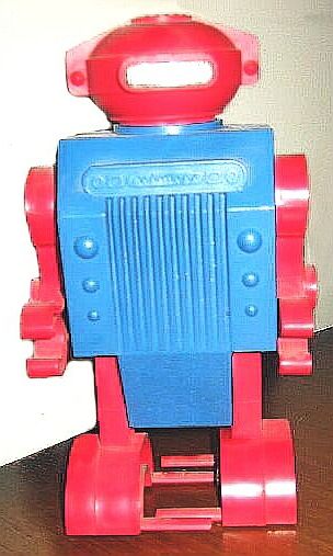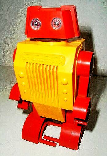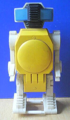 The robot walks forward (stepover walk), moves arms and turns the light in the head (eyes) on and off. Its height is 18 cm, and operates on 2 AA 1.5 V batteries. The robot is made of a variety of colors of plastic. The three robots have several parts in common, with RO 1 and RO 2 being more similar (same body and legs, shape of the hands). Sold in a cost saving box with both robots RO 1 and RO 2 (on opposing sides) pictured.