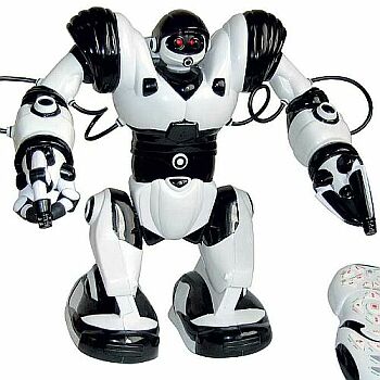 | 2. Robosapien is a white and black humanoid robot 34 cm tall, most widespread and well known WowWee robot, has 3 sing-and-dance demos (Someone else's video www.youtube.com/watch?v=Z0qJIIh9G44). He walks, moves arms, makes noises (does not talk), reacts to touching tip of his hands and toes. After he introduces himself, we invite children to play with him and challenge Tri-bot in football. Robots at this stage in their development are still not fit to play football, but brawls over the ball between stocky and slow Robosapien with strong arms and slender and fast Tri-bot are sure to make the crowd cheer. After the game robots go to the Robomaster's corner where they are loaded with candy that they carry to their teams. Robosapien brings candy in bags hanging from his hands, while Tri-bot has a tray in his hands. |